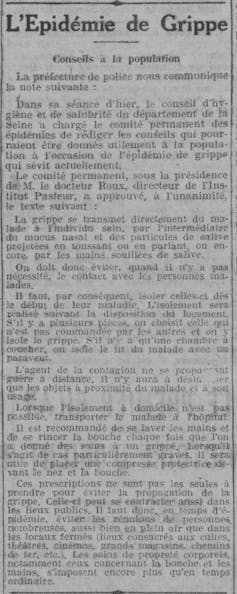 « Dans sa séance d’hier, le conseil d’hygiène et de salubrité du département de la Seine a chargé le comité permanent des épidémies de rédiger des conseils […] : la grippe se transmet se transmet directement du malade à l’individu sain par l’intermédiaire du mucus nasal et des particules de salive projetées en toussant ou en parlant, ou encore, par les mains souillées de salive.