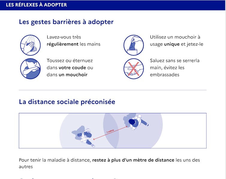 On doit donc éviter, quand il n’y a pas nécessité, le contact avec les personnes malades. Il faut, par conséquent, isoler celles-ci dès le début de la maladie […] Il est recommandé de se laver les mains et de se rincer la bouche chaque fois que l’on a donné des soins à un grippé. Lorsqu’il s’agit de cas graves, il sera utile de placer une compresse protectrice devant le nez et la bouche. Il faut […] éviter les réunions de personnes nombreuses, aussi bien en plein air que dans les locaux fermés (lieux consacrés aux cultes, théâtres cinéma, grands magasins, chemins de fer, etc.). »