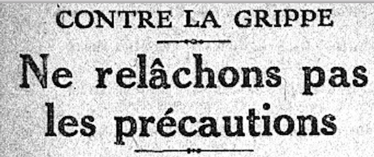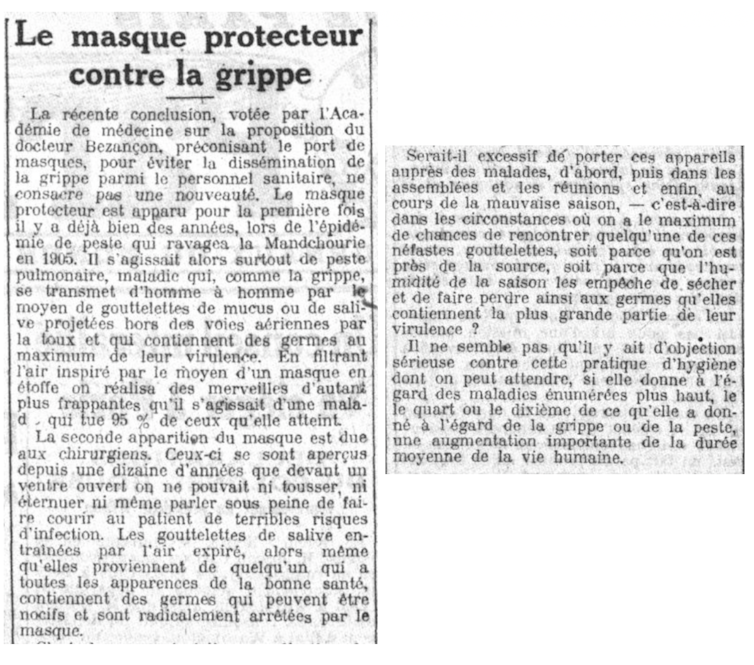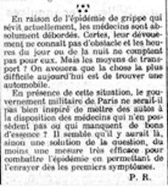 « Les pouvoirs publics ne semblent pas avoir entrepris contre la grippe – dont les méfaits vont en augmentant – une lutte pratique sérieuse. Tout s’est à peu près borné à des affiches et à des circulaires. Il y a pourtant des mesures urgentes à prendre. […] L’heure n’est pas aux demi-précautions ». (Le Journal, 19 octobre 1918)