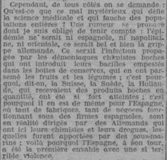 « Cependant, de tous côtés on se demande : qu’est-ce que ce mal mystérieux qui défie la science médicale et qui fauche des populations entières ? Une rumeur se propage dont je suis obligé de tenir compte : l’épidémie ne serait ni espagnole, ni napolitaine, ni orientale, ce serait bel et bien la grippe allemande. Ce serait l’infection propagée par les démoniaques chimistes boches qui ont introduit leurs bacilles empestés dans les boîtes de conserve, qui en ont parsemé les fruits et les légumes ; c’est pourquoi, dit-on, la Suisse, la Suède, la Hollande, qui recevaient des produits boches en quantité, ont été si fort atteintes ; c’est pourquoi il en est de même pour l’Espagne, où tant de fabriques, tant de négoces fonctionnant sous des firmes espagnoles, sont en réalité dirigés par des Allemands qui ont ici leurs chimistes et leurs drogues, lesquelles furent apportées par des sous-marins ; voilà pourquoi l’Espagne, à son tour, a été la première envahie avec une si terrible violence. »