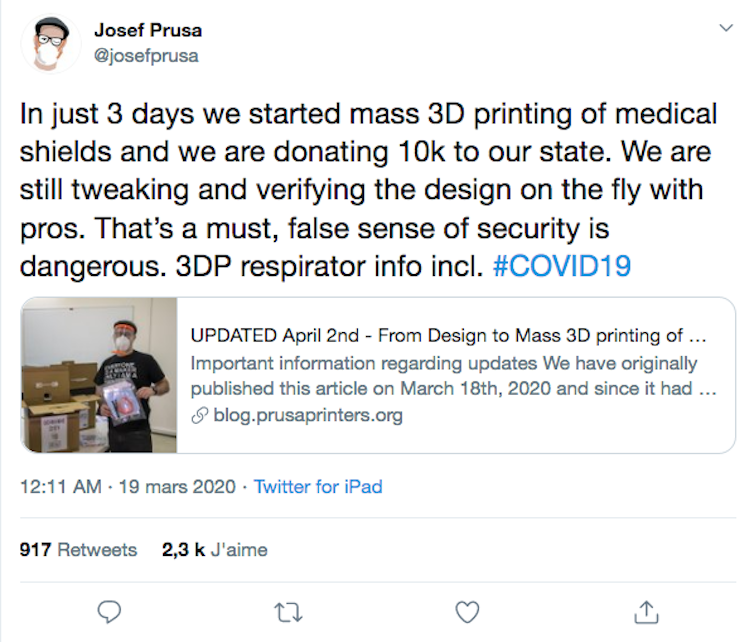Dès le début de l’épidémie en Europe début mars, il était clair qu’une pénurie de masques et d’équipements de protections individuels allait se produire. Le 19 mars, Josef Prusa – icône de la culture maker – publiait un design de visière de protection : un serre-tête imprimé en 3D, une feuille de plastique et une bande élastique pour le maintien. Il insistait sur le fait que les makers devaient être très vigilants et appelait à leur responsabilité : une protection inefficace est plus dangereuse qu’une absence de protection car elle donne une impression de fausse sécurité. Prusa Research a donc fait valider son design par le ministère de la santé tchèque – sans certification cependant.