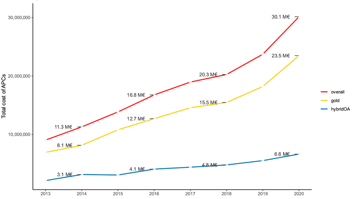 - the total cost of APCs has tripled in the period 2013-2020. The major driver is the growth of articles in Gold OA journals, i.e. fully open access journals with APCs (without this growth, the APC cost would have been multiplied by 1,69 instead of 3)