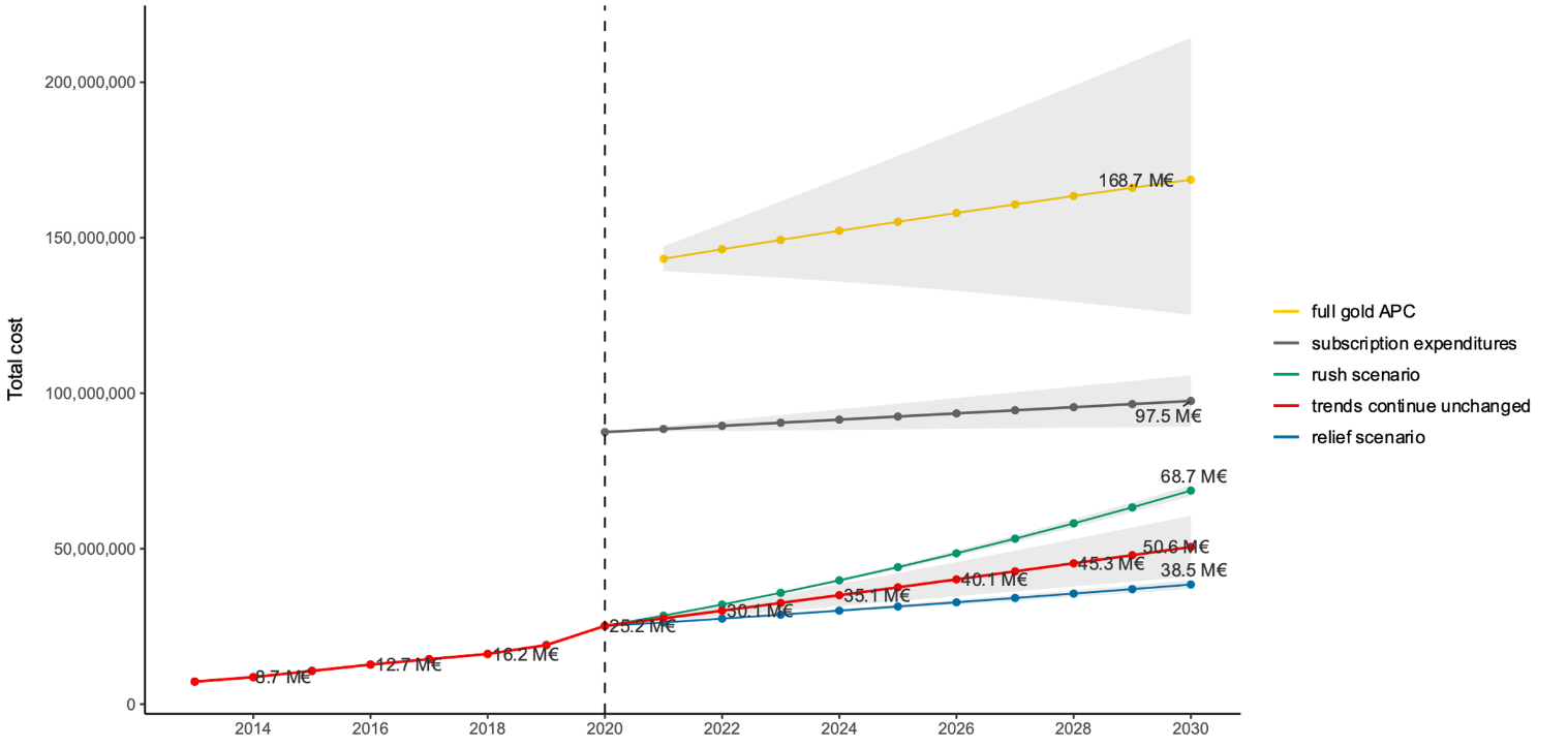 The evolution of the total journal subscription costs based on this average annual growth rate results in an estimated 97,5 M€ in 2030.